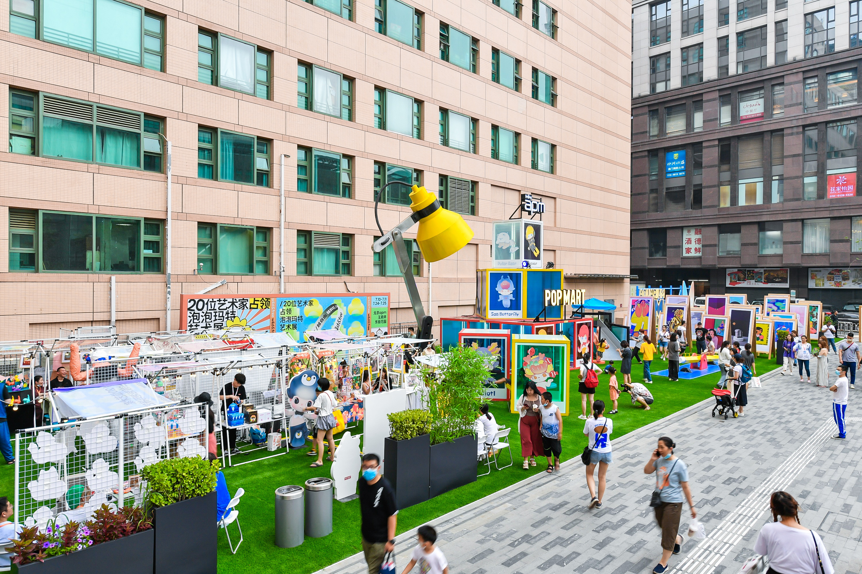 2021年七月〈20位艺术家占领泡泡玛特艺术展〉,有草坪,有音乐,有市集,还有高低错落的巨幅画作展出。虽说是「占领」,整体的活动视觉部分、艺术家作品都和场地原有的POPMART内容十分搭调。